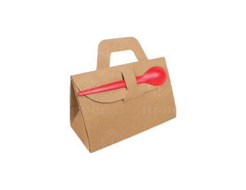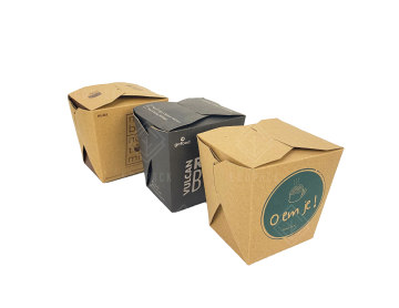Kemasan untuk olahan nasi, ayam, dan mie yang unik. Terdapat handle untuk memudahkan saat dibawa.